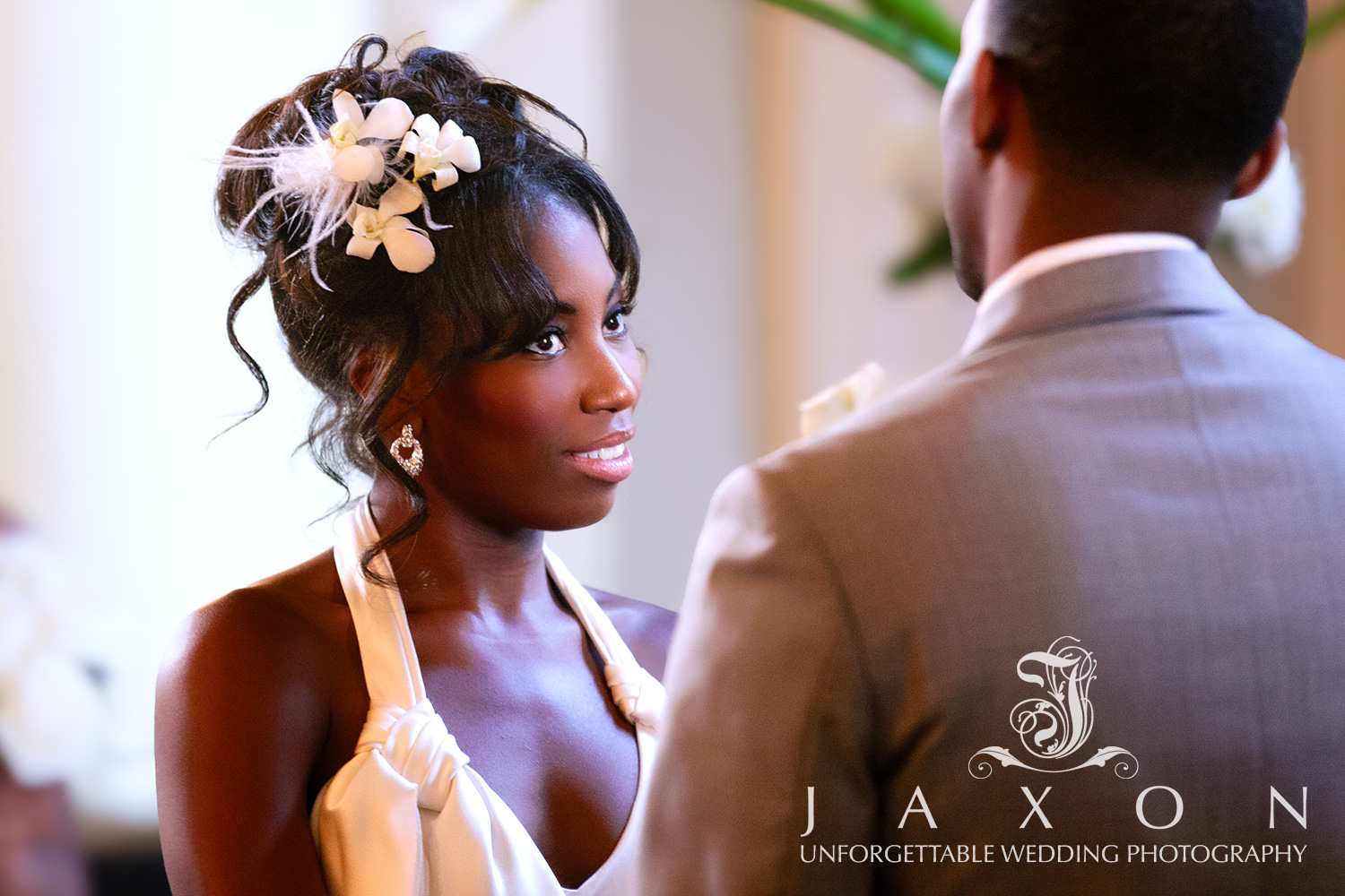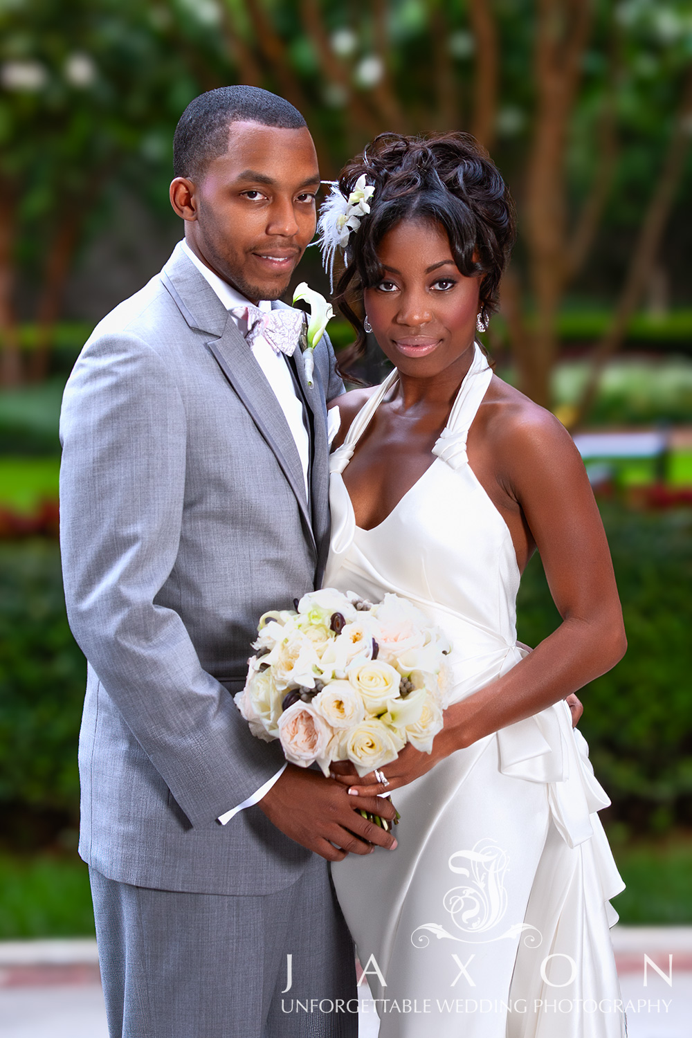 Nestled in the heart of Midtown, the Biltmore Ballrooms, renowned for its opulent decor, served as the perfect venue for their luxurious celebration. The day began with a serene preparation at the Renaissance Midtown Atlanta Hotel, conveniently located just a half block away, allowing the bridal party a short, picturesque walk to the Biltmore Ballrooms. Escorted by her father, Nicole made her grand entrance into the ballroom, which boasts a century-old handcrafted plaster relief ceiling, enormous restored bronze and crystal chandeliers, and oversized Palladian windows that bathe the room in natural light. The Tennessee marble floors added to the venue’s timeless elegance. Her radiant smile lit up the room as she walked down the aisle, lined with delicate white rose petals. Inspired by Diane Von Furstenberg, her gown was a stunning halter wrap dress adorned with a bow at the waist and chest, perfectly complementing her Floral Ankle Strap Sandals. Her white and blush pink roses, accented with white lilies, added a soft romantic touch to her look. Her hair, styled in an elegant updo with soft curls framing her face, was accented by a white feathered orchid, completing her bridal ensemble.