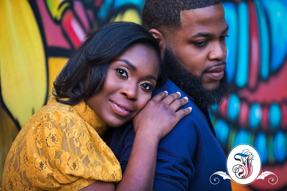 We started the engagement portraits at the imposing Mercedes Benz stadium just west of downtown Atlanta. The couple decked out in their red and black Falcons jerseys and carrying a football as a prop. It was clear from the get-go that PDA was not going to be a problem. The late evening traffic and onlookers did not deter them. A change of attire and we headed to everchanging colorful murals at Ponce City Market and North Avenue intersection of the Atlanta Beltline.