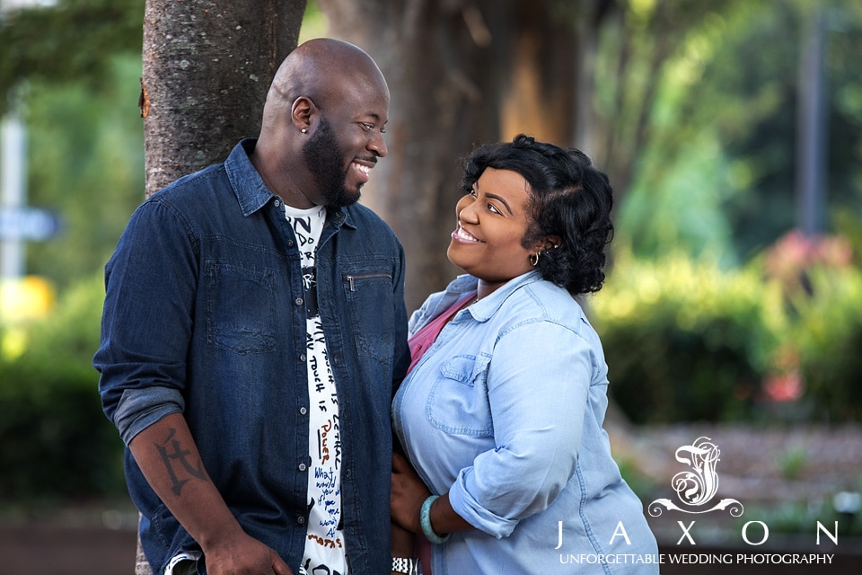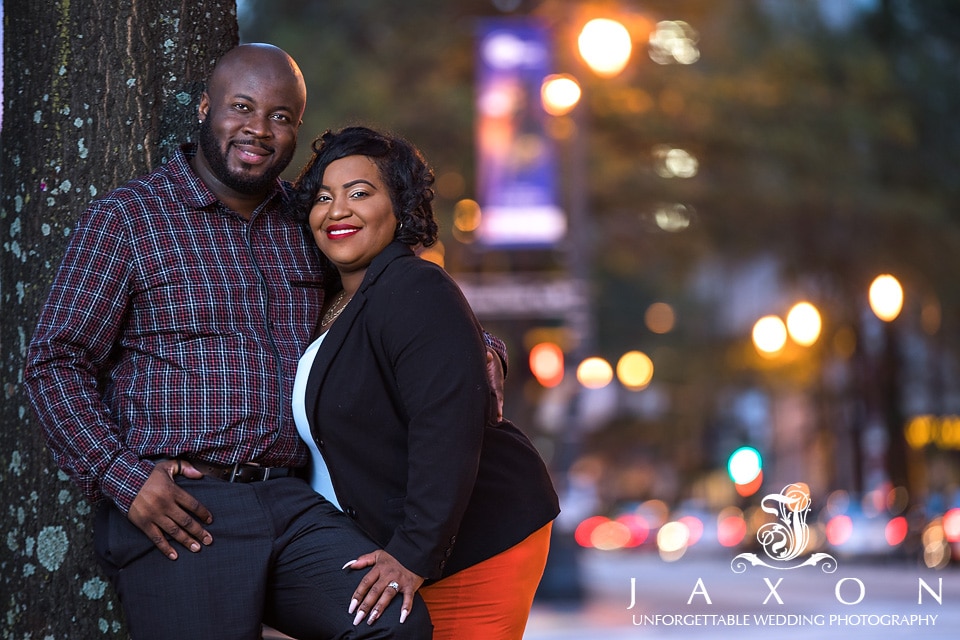 Atlanta’s Woodruff Park downtown was the location of choice for Takiya and Richie’s engagement photography session. The easy going Chicagoan had a chance encounter with the vivacious Atlantan a three years earlier. They both started working at the same company and met in the late summer. There were a few fits and starts but eventually, with some help from co-workers their office romance blossomed.