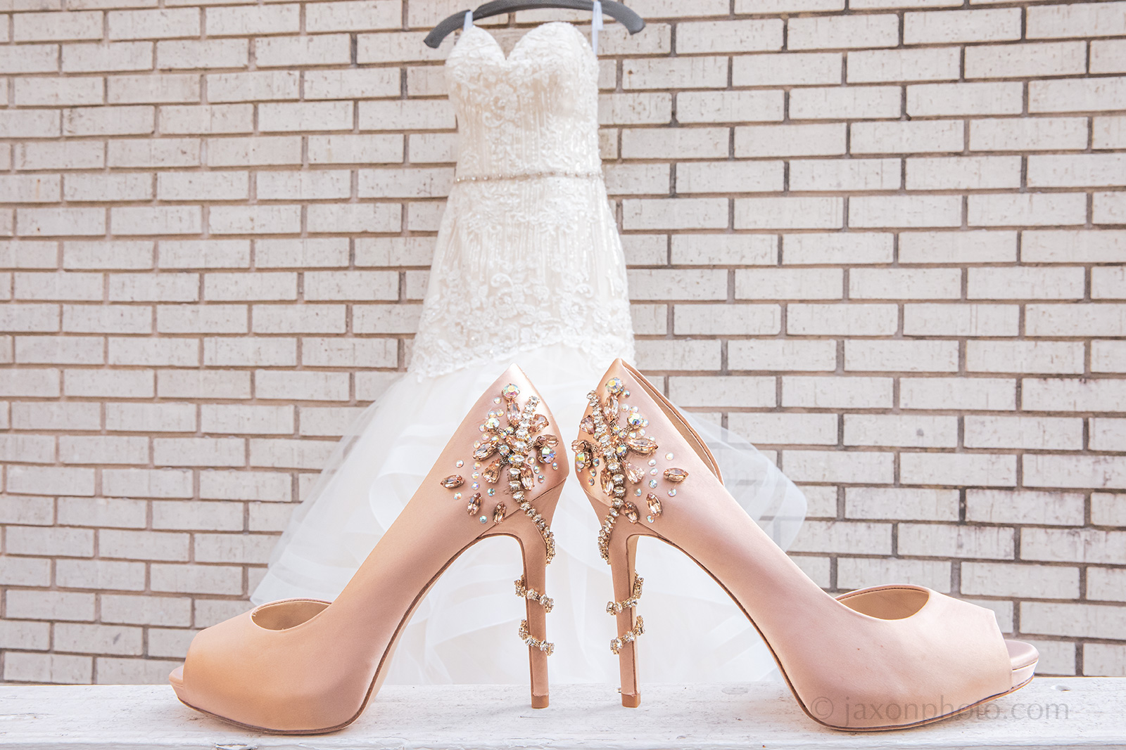 On her wedding day, the bride radiated elegance in an ivory gold, silver blush strapless embroidered mermaid gown adorned with ruffles at the hem. She made a dramatic entrance, crossing the upper-level terrace bridge as guests eagerly watched. Descending the last flight of stairs, she was greeted by her father. An attendant nearby gracefully knelt to swap her golden ballerina slippers for a pair of exquisite Natural Carean Jewel Detailed peep-toe pumps by Antonio Melani perched on a white faux fur. Our bride entered the aisle with one hand on her father’s arm and the other clutching a stunning bouquet of Peonies, Mother of Pearl, and Sahara Roses. One of our photographers captured many images of this dramatic part of the ceremony.