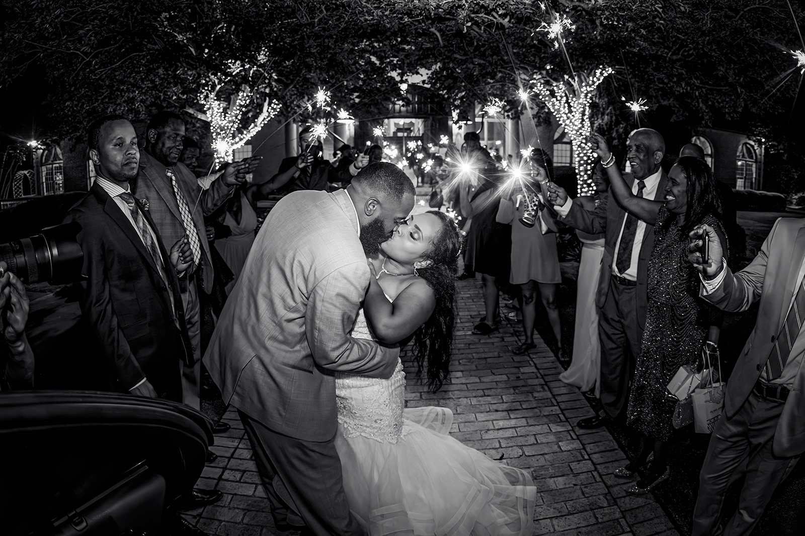 The sendoff was equally touching. The guests lined the walkway in front of Vines Mansion with sparklers lit. The newlyweds danced through, culminating with a kiss at the end of the line. Our photographers captured the couple looking exhausted and happy at night’s end in their limousine.